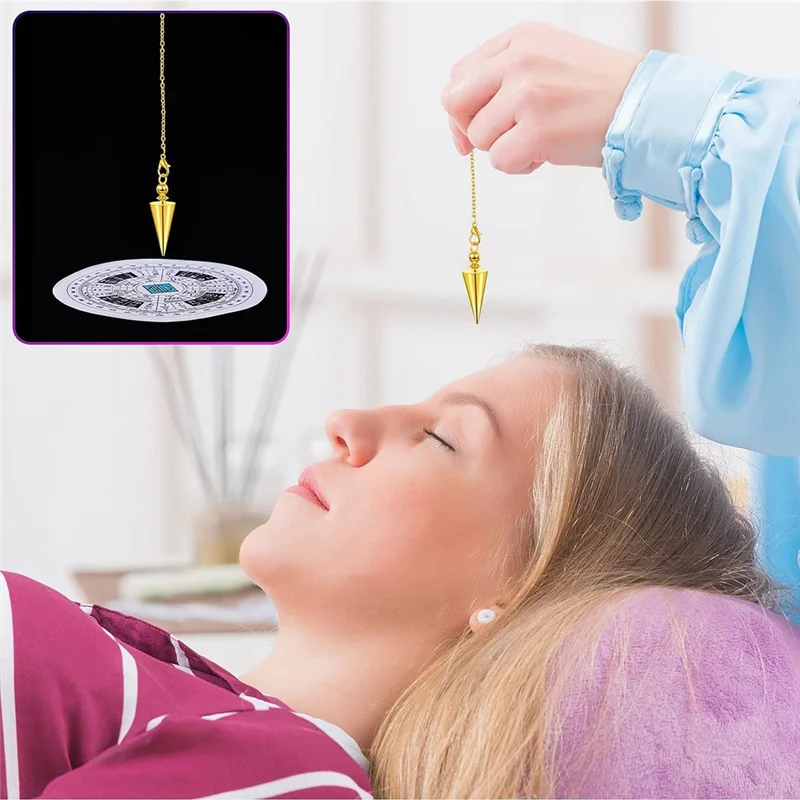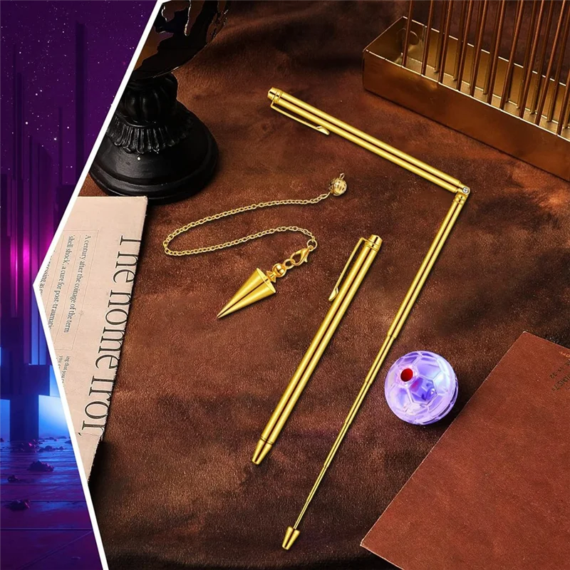 Complete 4-piece set โ Pen-style dowsing rods, gold pendulum, LED light-up ball