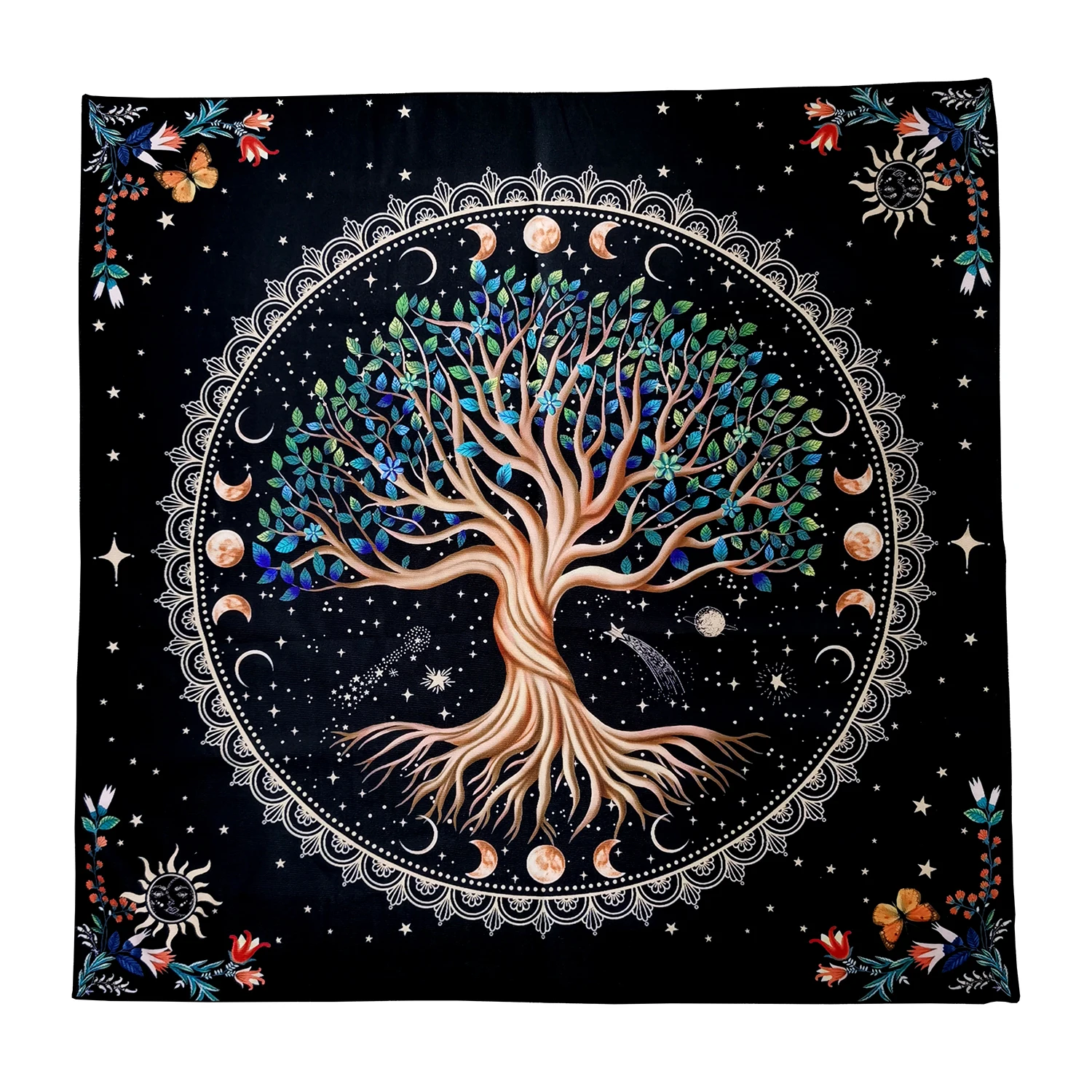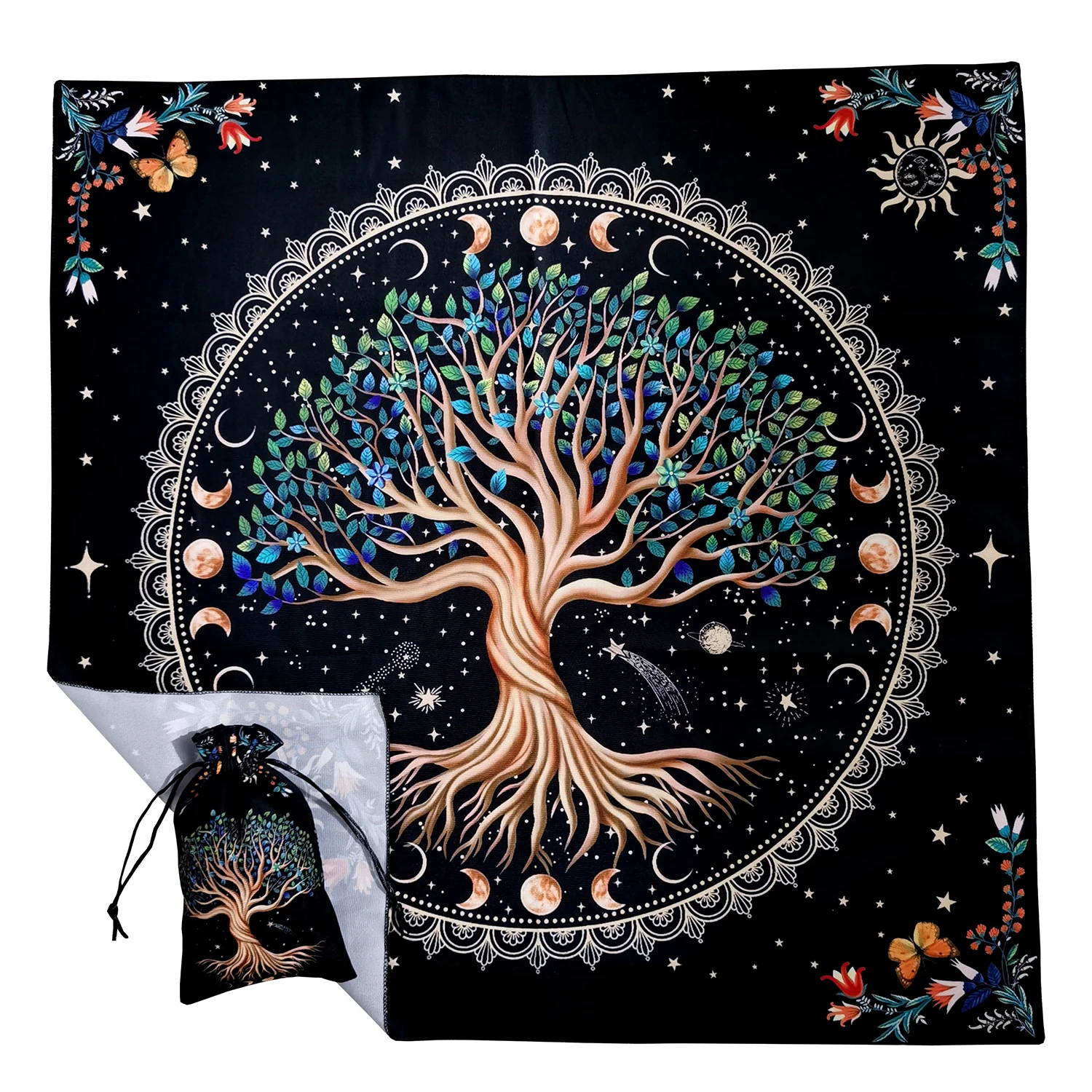 Elevate your spiritual practice with this beautifully designed Tree of Life Tarot Card Tablecloth. Featuring vibrant celestial patterns, moons, and stars encircling a radiant Tree of Life, this altar cloth is perfect for tarot, oracle, and divination sessions. Comes with a matching velvet drawstring bag for your cards or crystals.