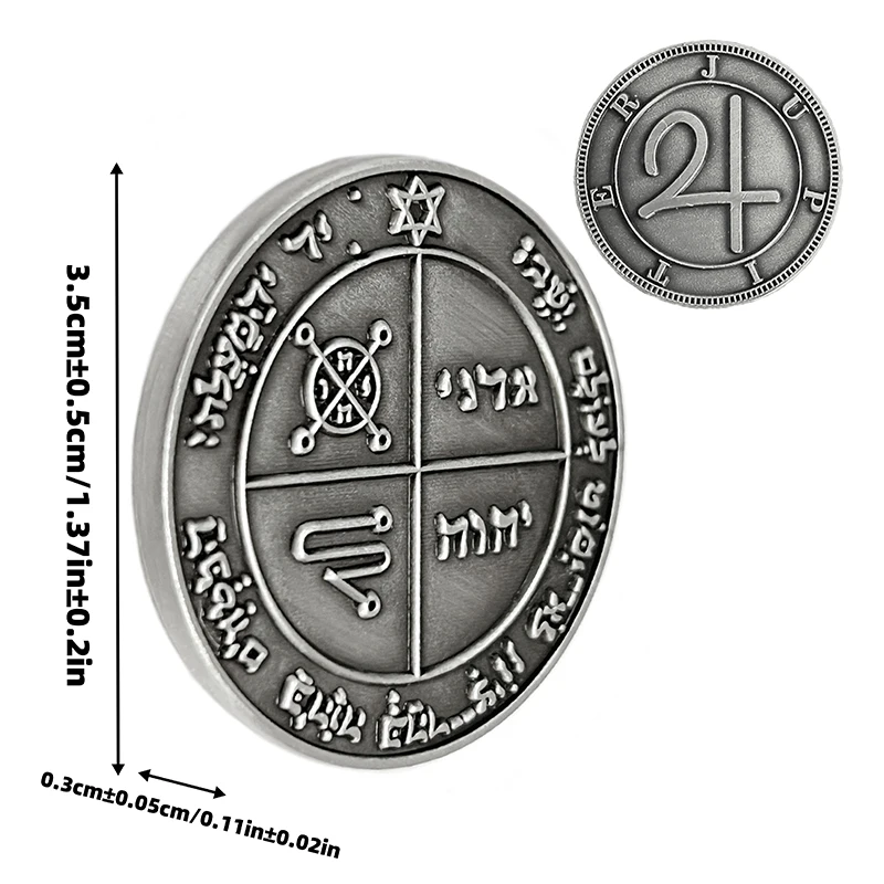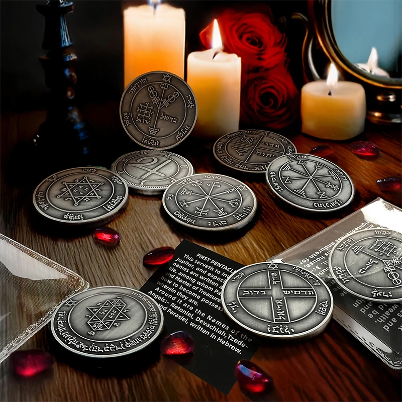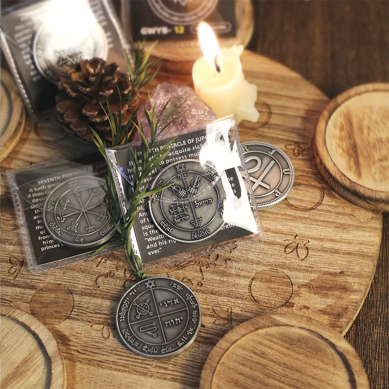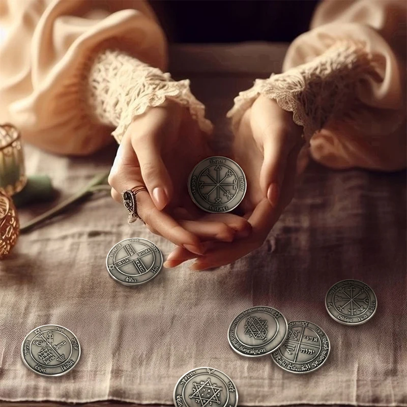 Metal talisman with raised Solomonic-style seals—use the lines as a focus point to steady attention before messaging, meetings, or money work.