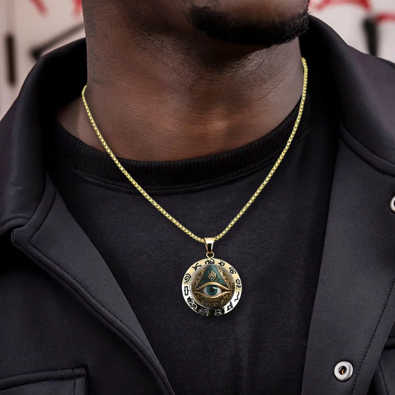 Forged in gold, bordered by the tongues of ancient script, this pendant carries the memory of an older sun — the one that shone before men forgot the language of light.