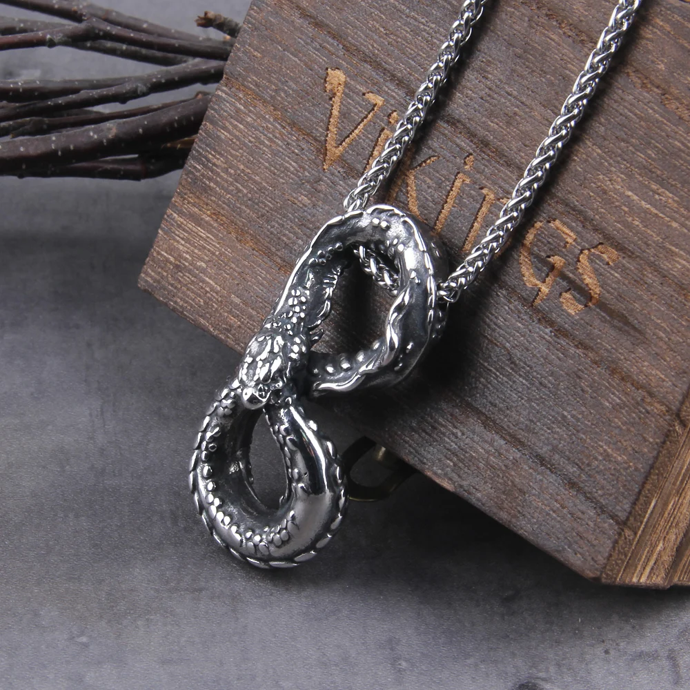 In Norse tradition, it echoes Jörmungandr, the great world serpent encircling the earth, representing the balance of chaos and order. Worn as a talisman, it reminds the wearer of their inner strength, resilience, and the endless possibilities of transformation. Presented in a rustic wooden box, it blends mythic meaning with bold style.