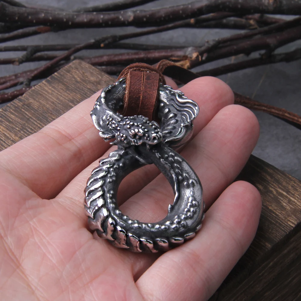 ✨ The Ouroboros, the serpent consuming its own tail, is one of the oldest symbols of eternity, unity, and rebirth. This Viking-inspired pendant, crafted in stainless steel and hung on a leather cord, carries the mystery of the infinite cycle—where endings and beginnings are one. Revered across cultures, the Ouroboros embodies the eternal flow of creation, destruction, and renewal.