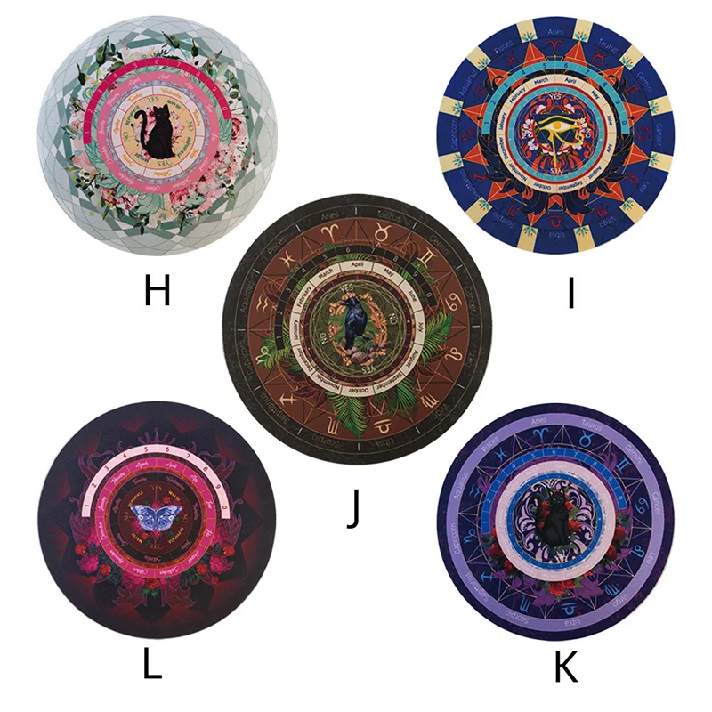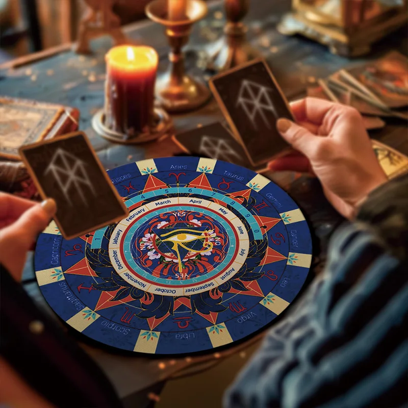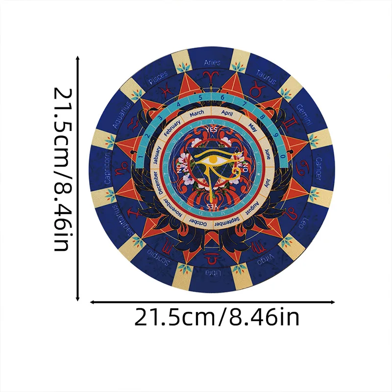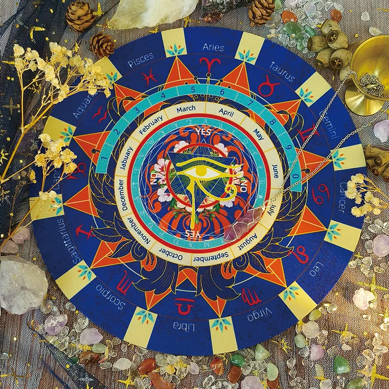 Use the board to slow the mind and give your pendulum a vocabulary. The Eye of Horus sits at center as a guardian of clear sight; the zodiac and months around it keep your reading anchored in time. Begin each session by calibrating yes/no/maybe, then ask one honest, specific question. Let the swing answer—your job is to breathe and listen.