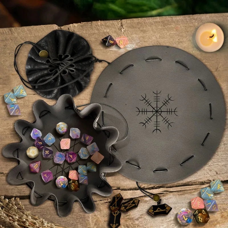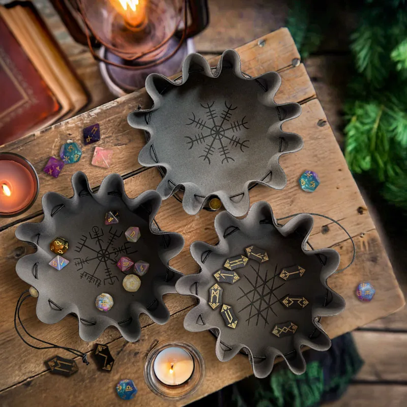 Use this laced bowl as a small “field of meaning” for runes, coins, or dice. The Norse sigils in the center (Helm of Awe, Vegvísir, or Grid) aren’t decoration—they’re anchors for attention. Draw a rune, shake the pouch, and let them fall into the bowl. Where they land shows emphasis; what lands face-down is background. One question. One breath. Then read.